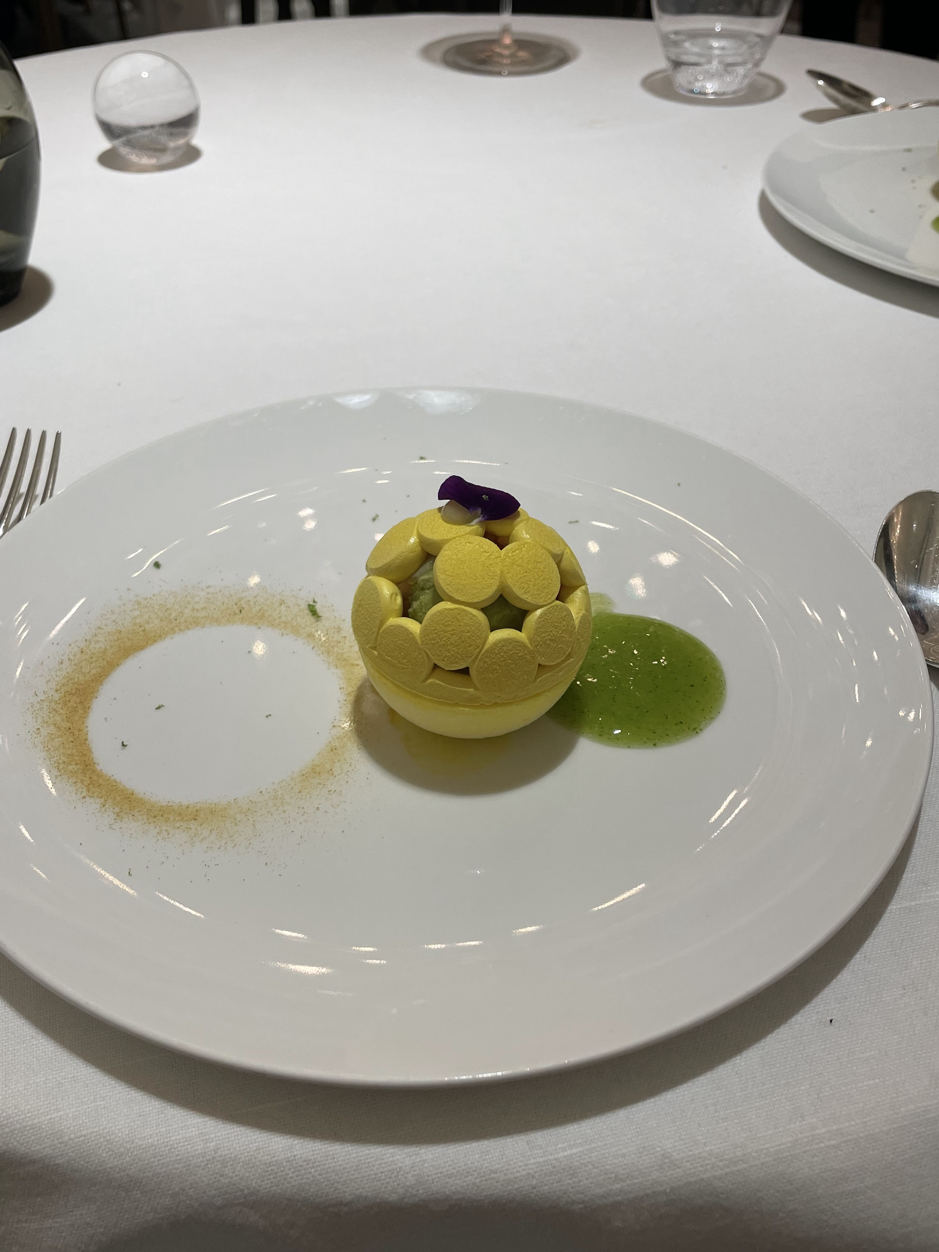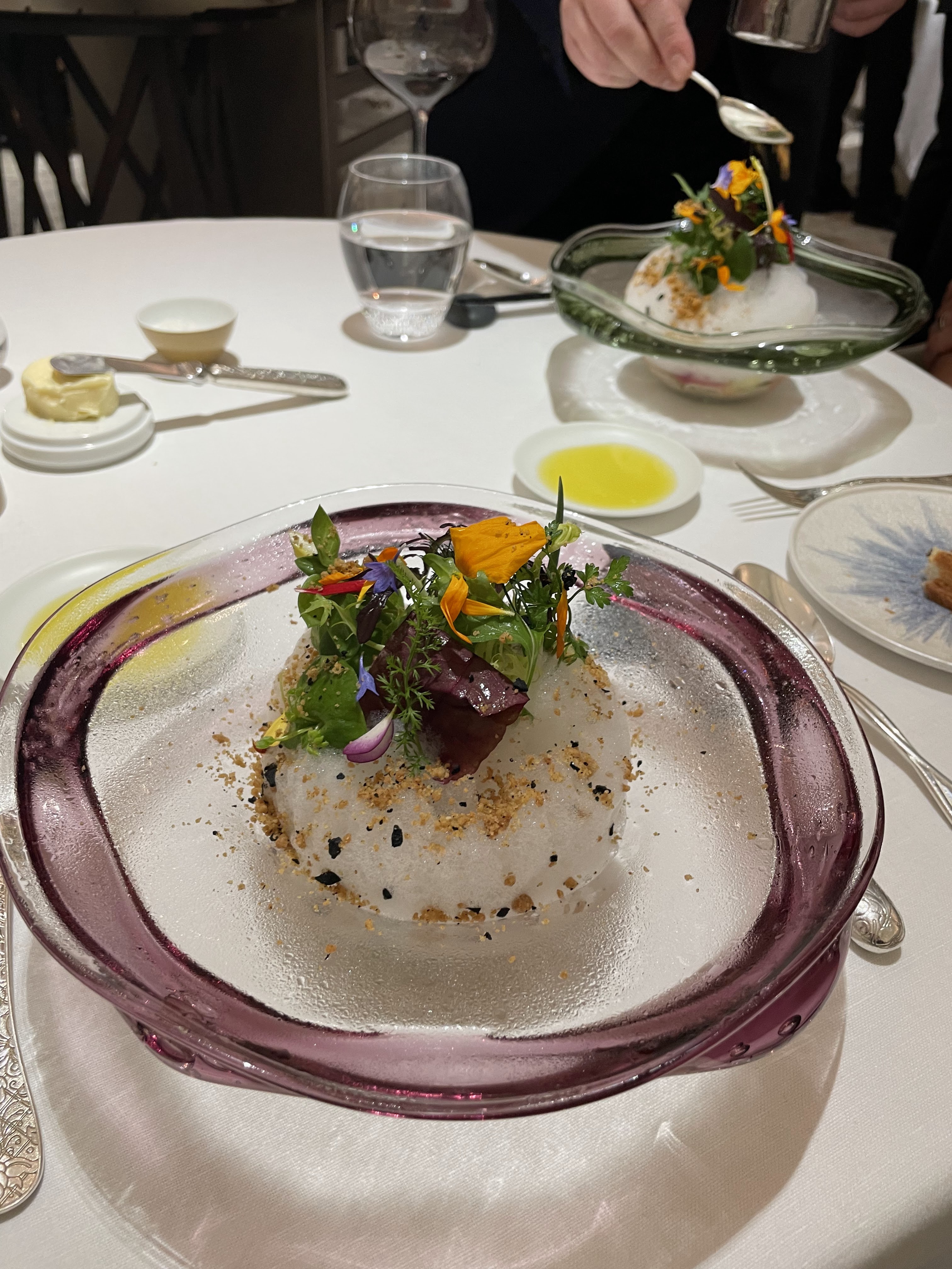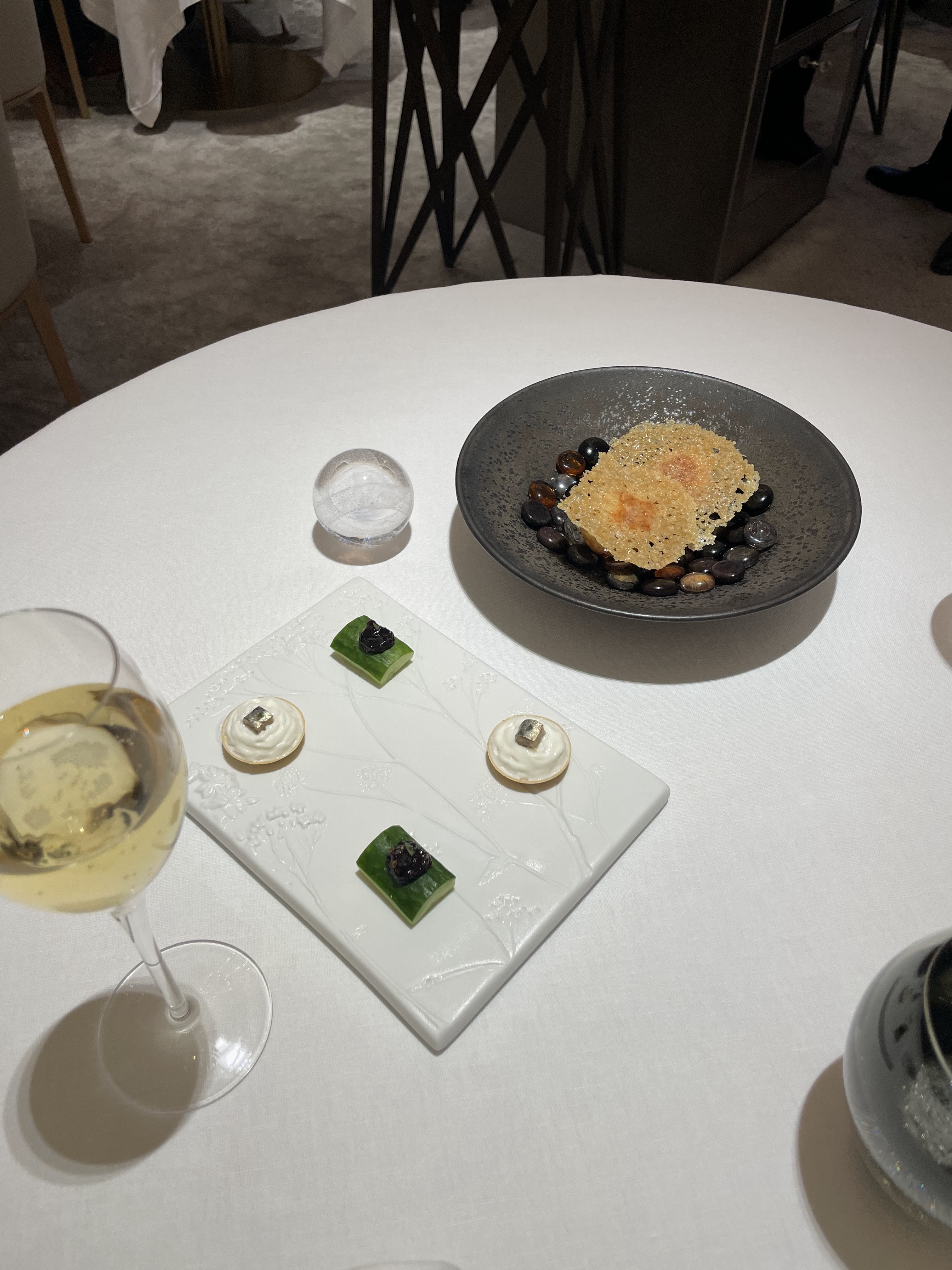 식전주와 기본적인 테이블 세팅입니다. 개인적으로는 미슐랭을 받은 식당들이 어떤 식기를 쓰는지도 궁금했는데, 기본적인 물 잔도 꽤나 느낌이 있었습니다.