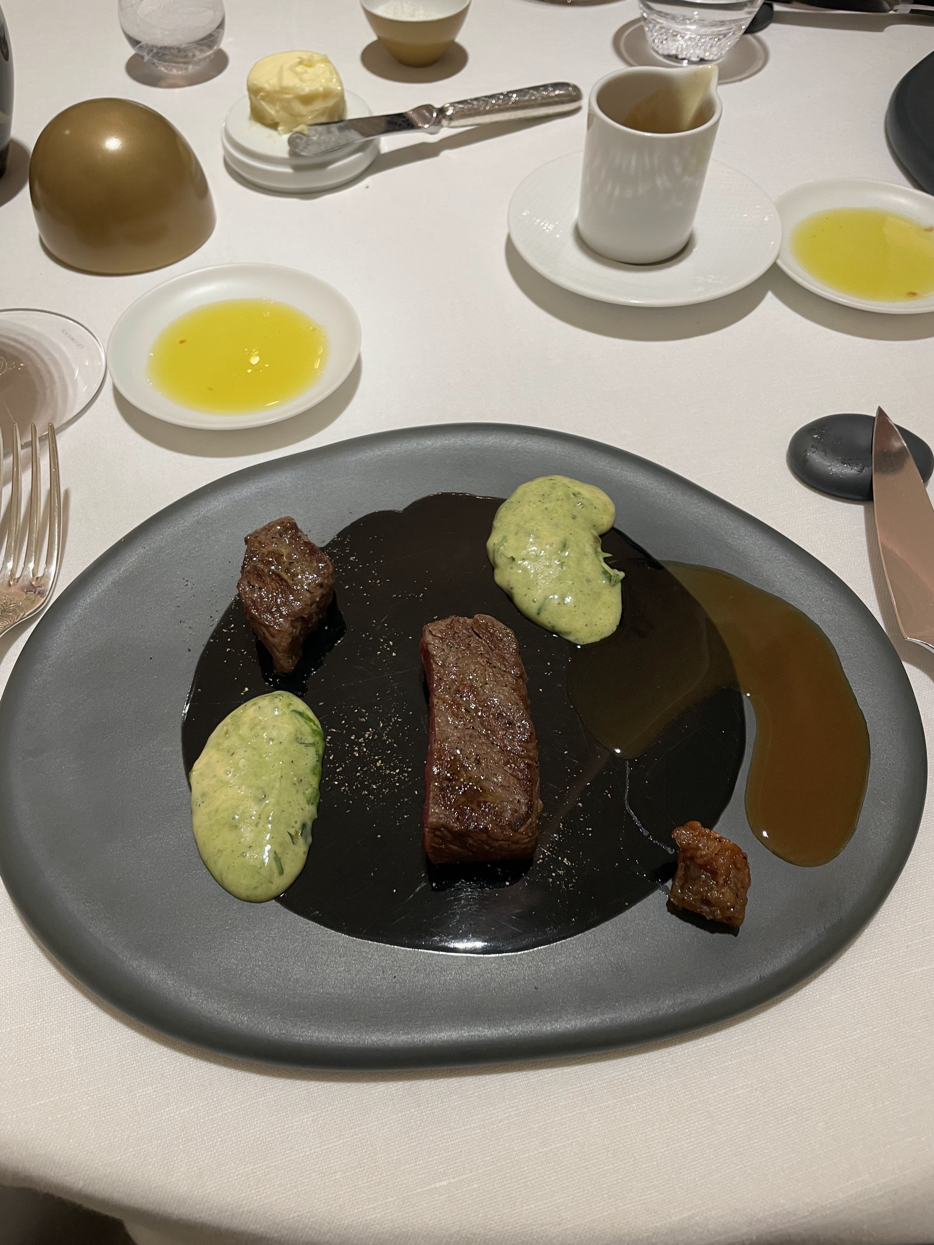 등심과 안심이 한 점씩 서브되었으며 우측의 소스는 송아지에서 뽑은 주스로 만들었다고 한다.
